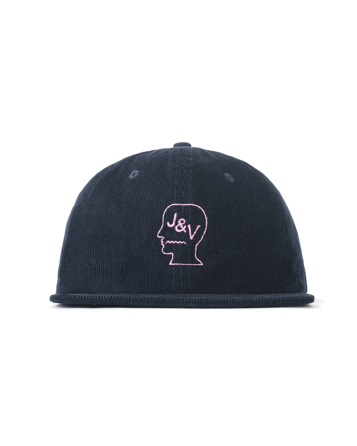 Natural Corduroy body in Navy. Corduroy brim. Logo Head in a six-panel build. Plastic Snap Closure. Interior Brain Dead Label. Custom Brain Dead for Jon & Vinny's Pink Logo Embroidery