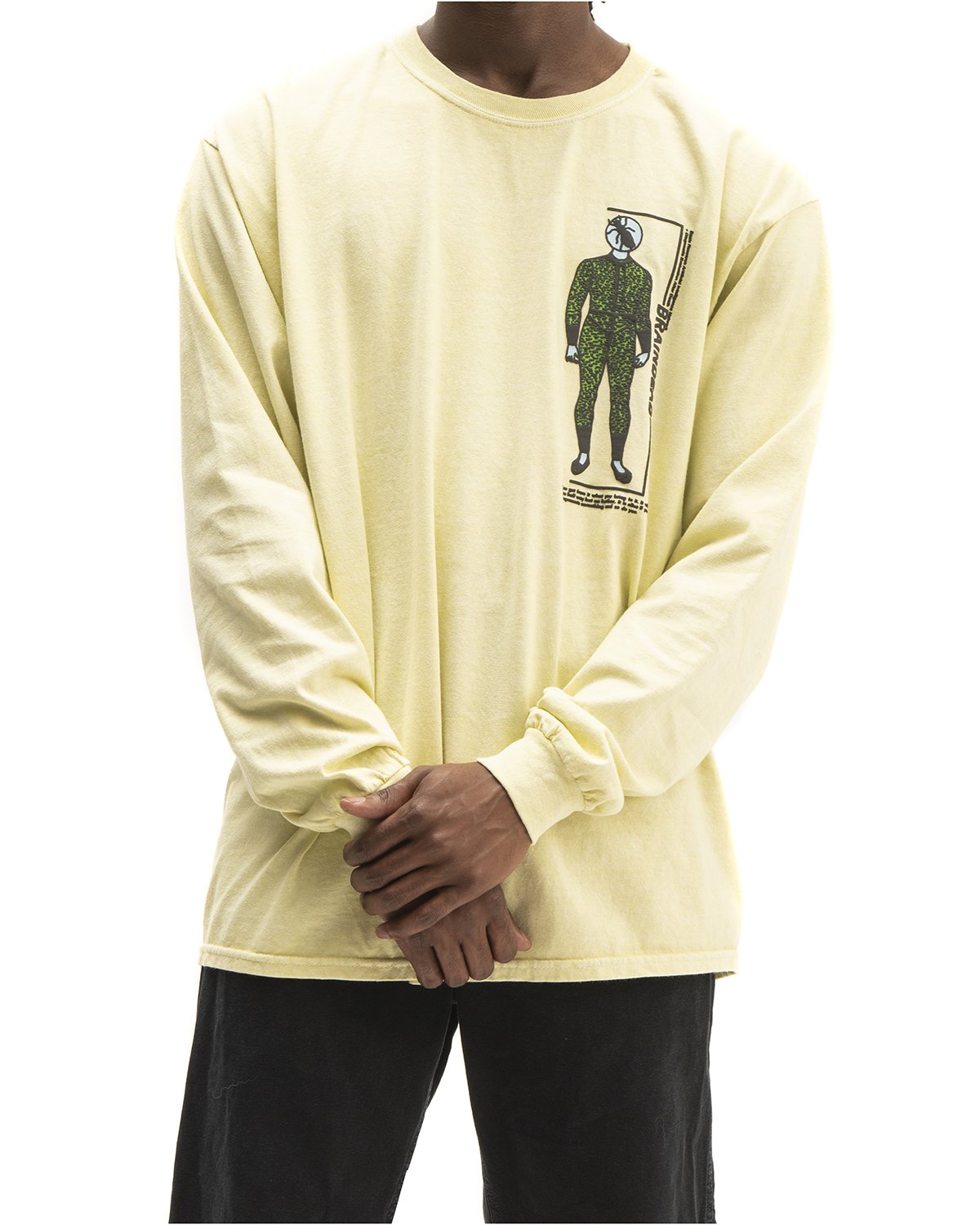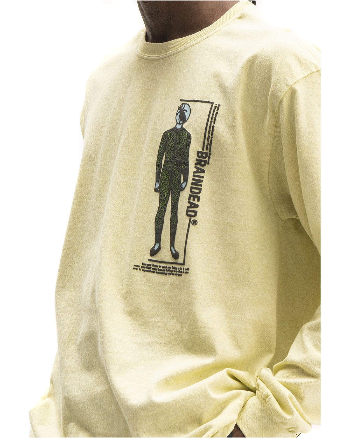 Graphic long sleeve t-shirt. Brain Dead humanoid front graphic. Back basic research artificial intelligence network graphic.