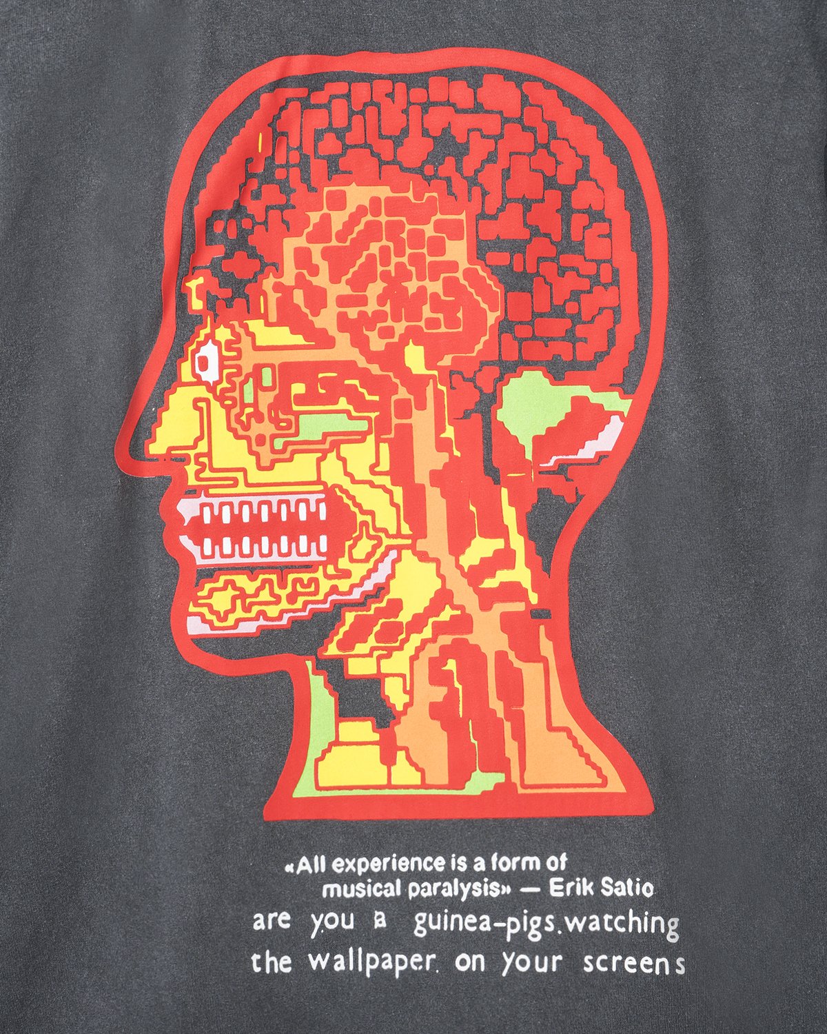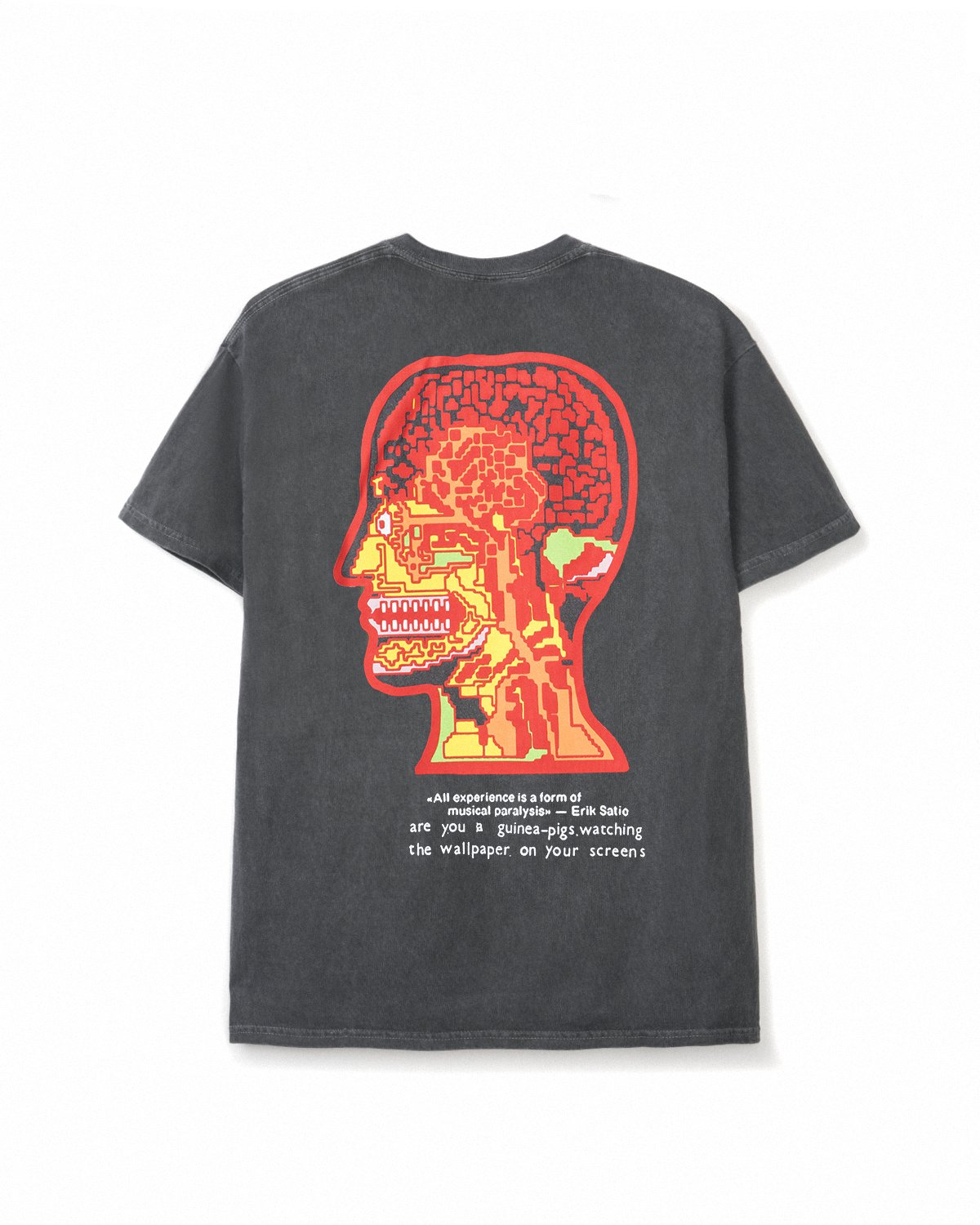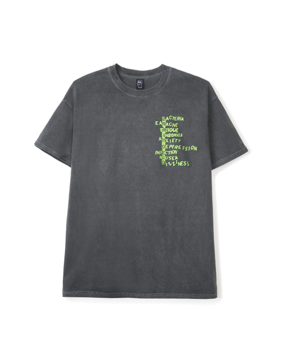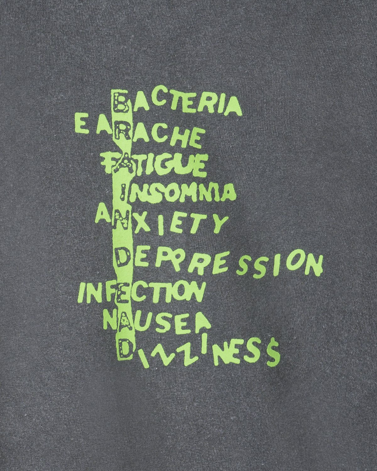 Our classic beloved T-shirt. Red back logo bitmapped graphic. Front text reads bacteria earache fatigue insomnia anxiety depression infection nausea dizziness