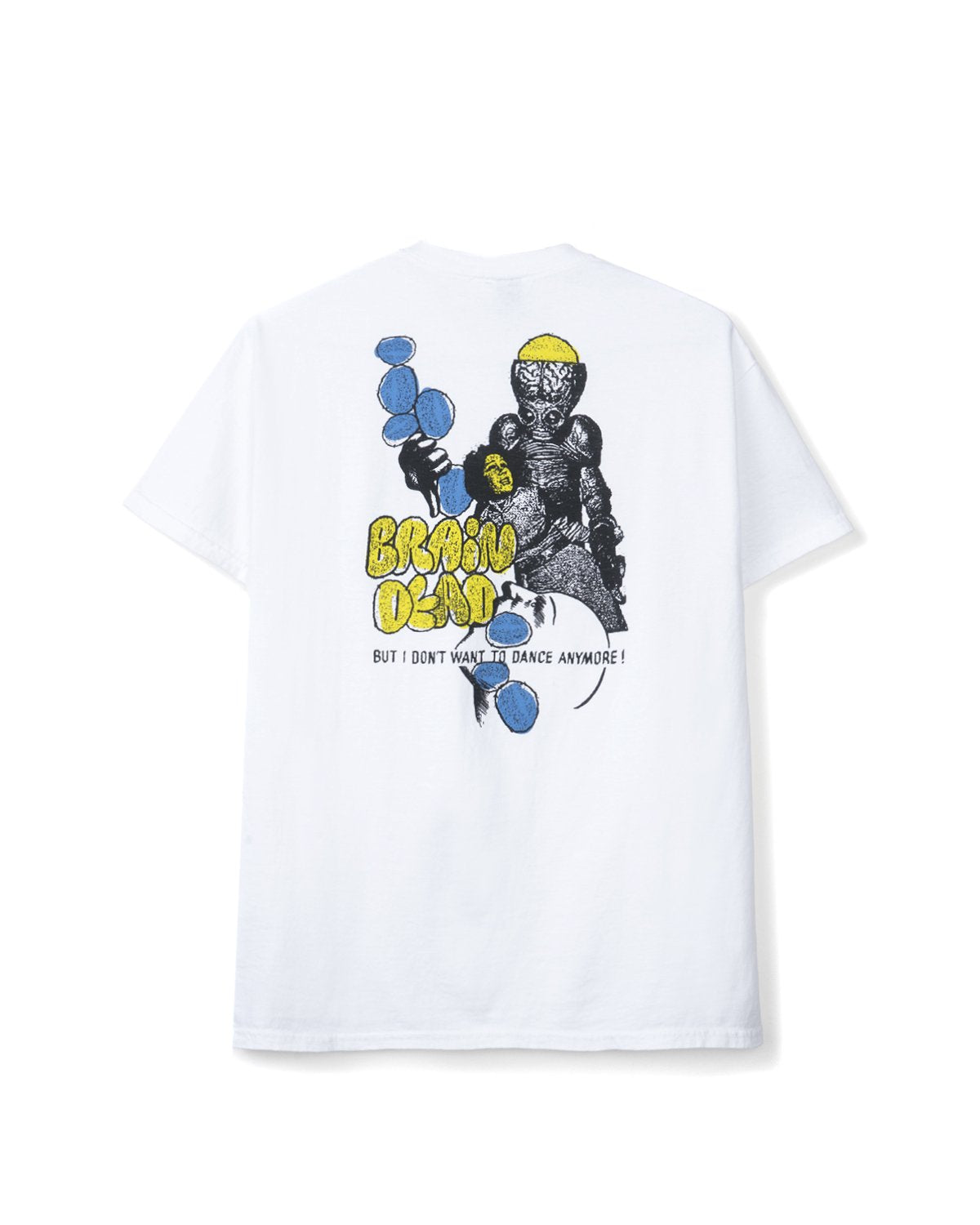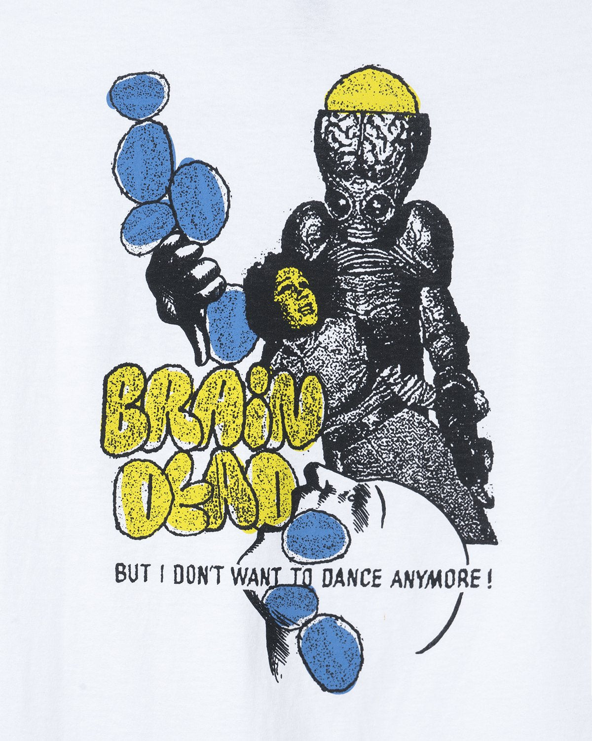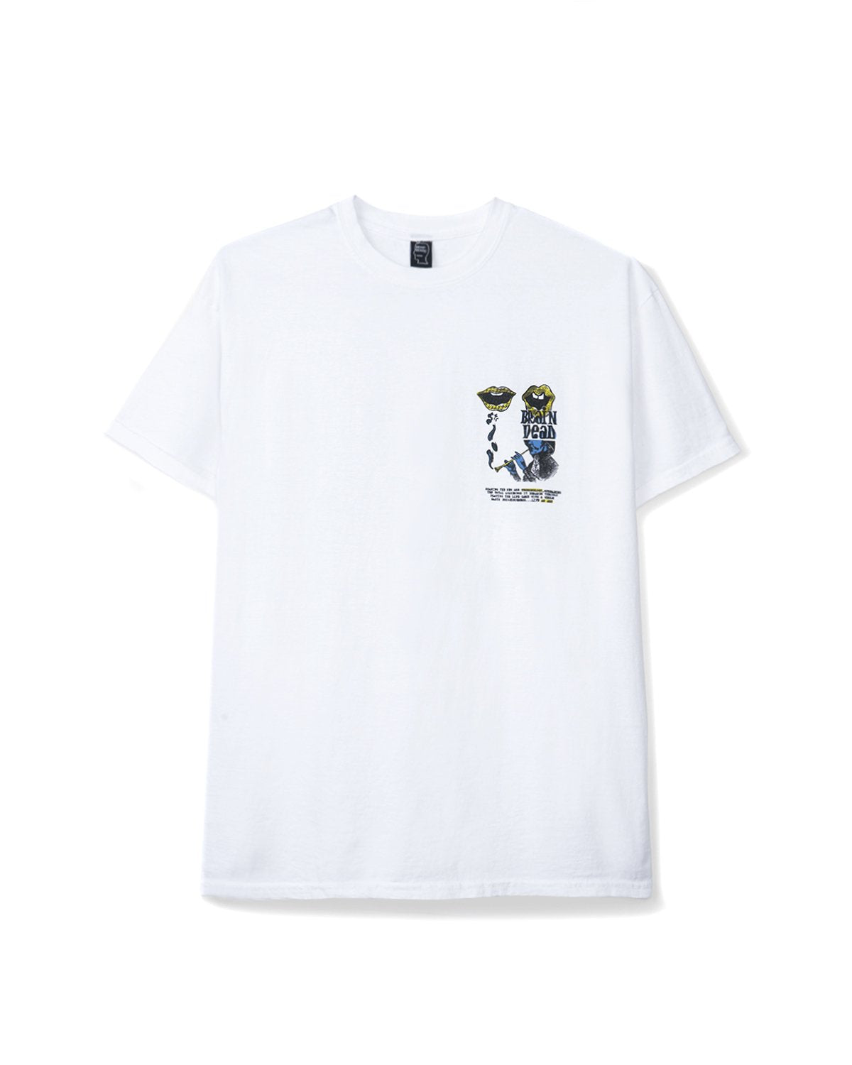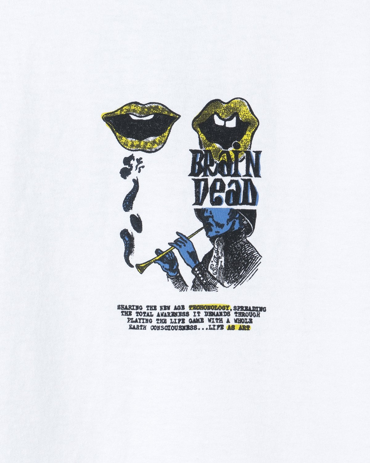 Our classic beloved T-shirt. Front top left graphic features a whistler in black over blue and two mouths in black on yellow. Text below reads searing the new age technology, spreading the total awareness it demands through playing the life game with a whole earth consciousness...life as art