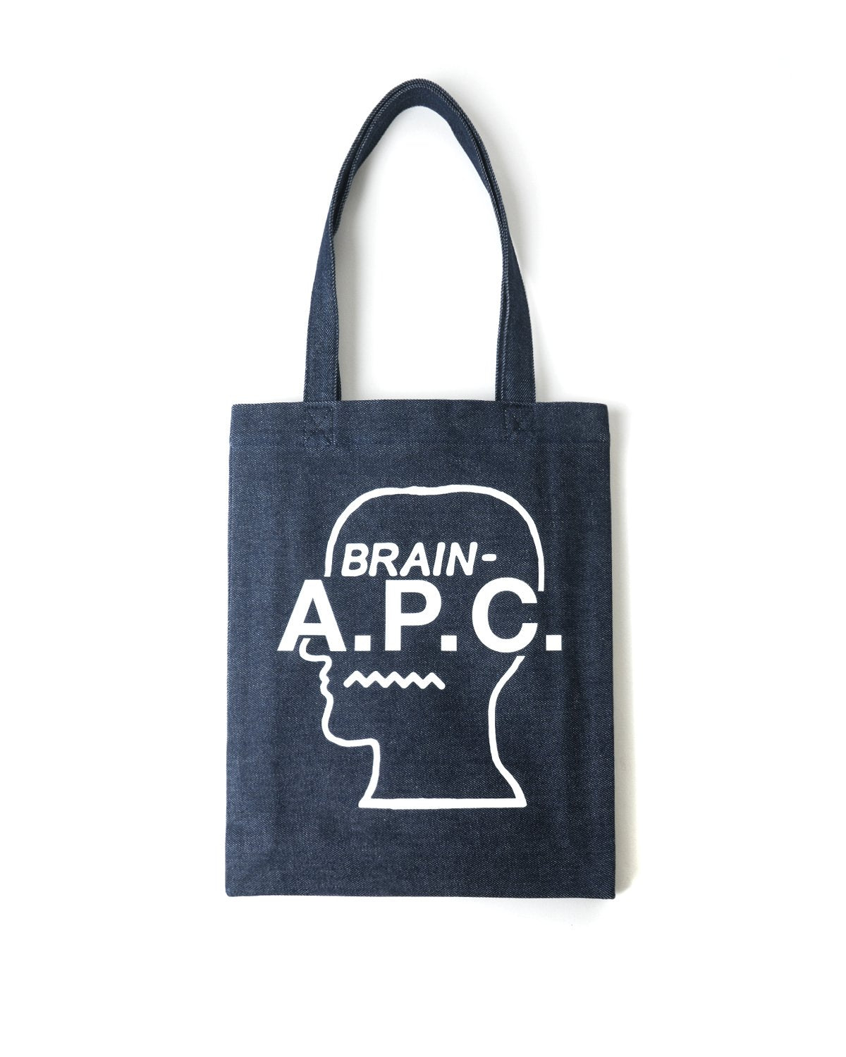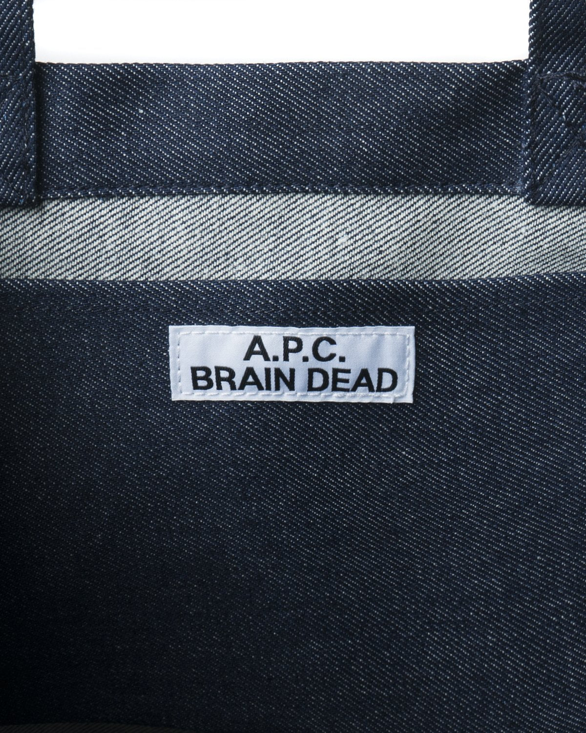 Denim. Japanese material. Topstitched hem at top of bag. Two handles with topstitched X. May be carried on shoulder or by hand. Long band, cut in a single piece, on sides and at the bottom. Brain Dead interaction: coloured drawing silkscreened on front and back. Interior pocket suspended at top from hem. Label with Jacquard 'A.P.C. BRAIN DEAD' logo on pocket. Tone-on-tone interior stitching. Dimensions: 44 x 36 x 14 cm.
