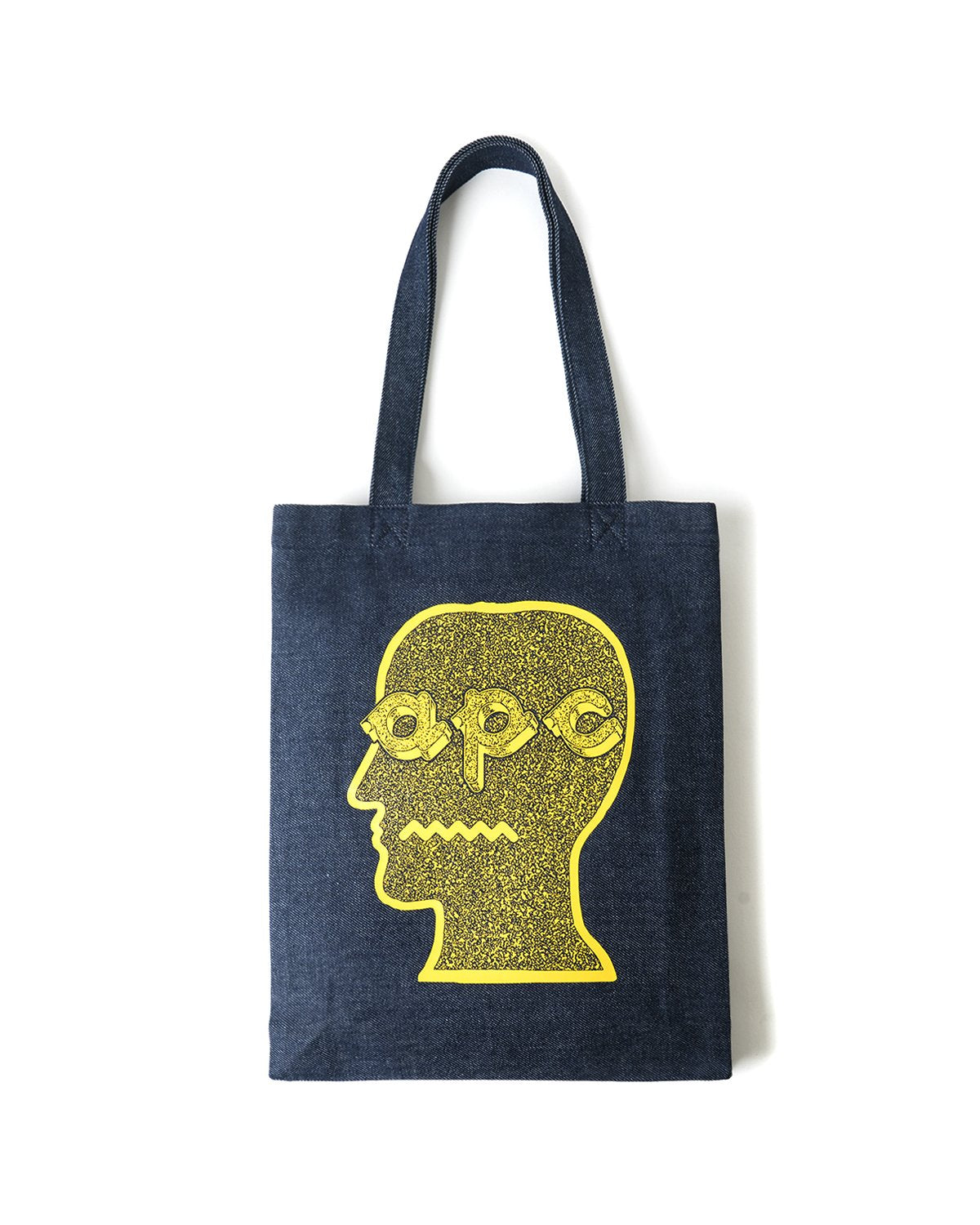 Denim. Japanese material. Topstitched hem at top of bag. Two handles with topstitched X. May be carried on shoulder or by hand. Long band, cut in a single piece, on sides and at the bottom. Brain Dead interaction: coloured drawing silkscreened on front and back. Interior pocket suspended at top from hem. Label with Jacquard 'A.P.C. BRAIN DEAD' logo on pocket. Tone-on-tone interior stitching. Dimensions: 44 x 36 x 14 cm.