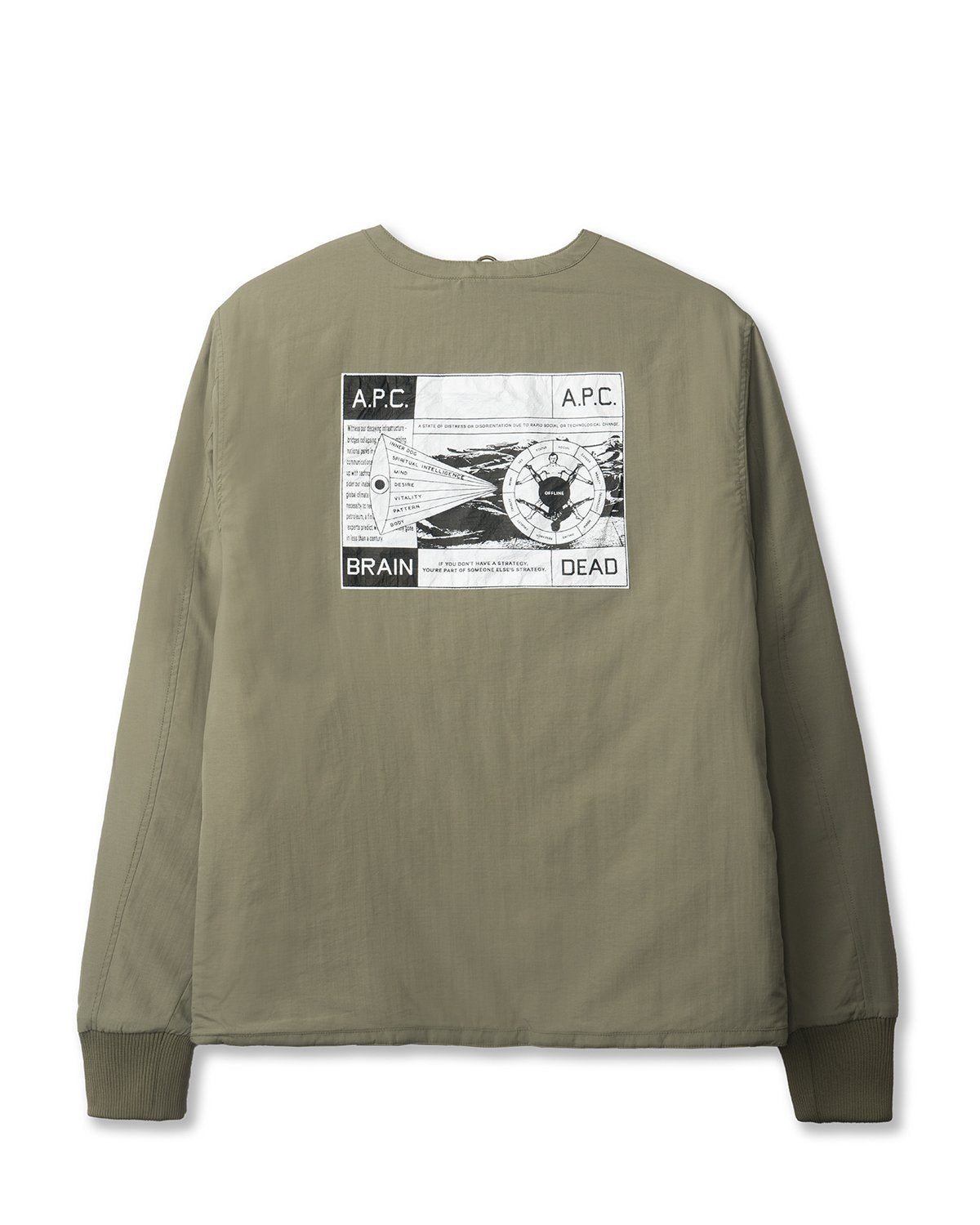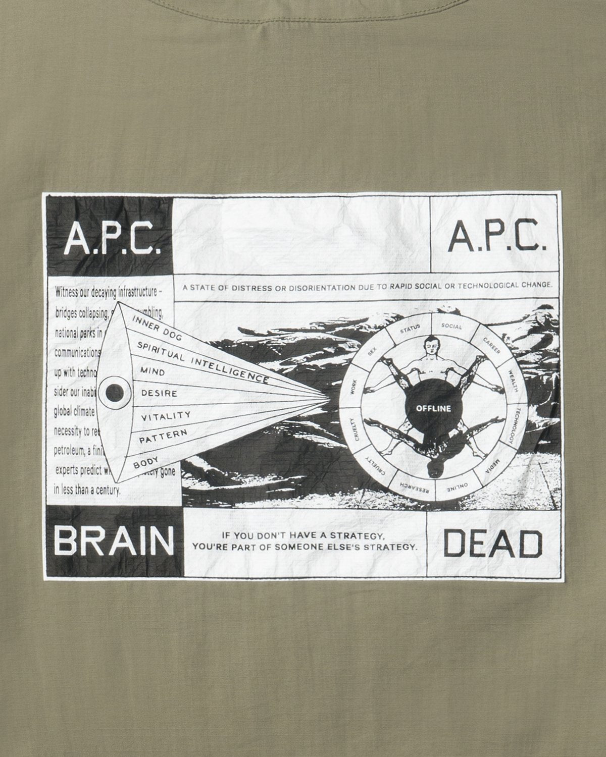 Japanese denim. Printed motif on front, including pockets. Straight cut. Classic collar. Buttoned cuff. Oversize fit. Five engraved buttons. Engraved metal rivets. Two patch pockets. Breast pocket. Brain Dead interaction: revisited 'Brain-A.P.C.' logo in contrasting Jacquard on breast pocket. Removable waistcoat in nylon and ripstop. Zip closure. Printed motif on back reminiscent of perforated paper. Non-selvedge. The model is 185 cm tall and is wearing size M.