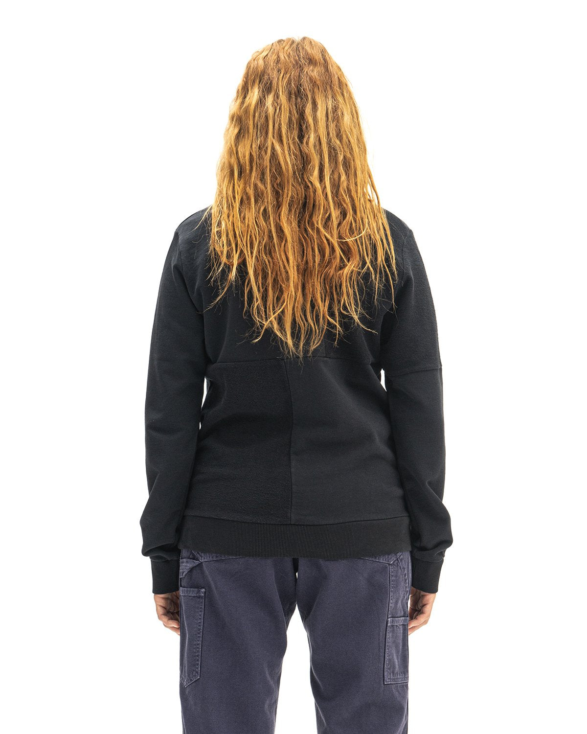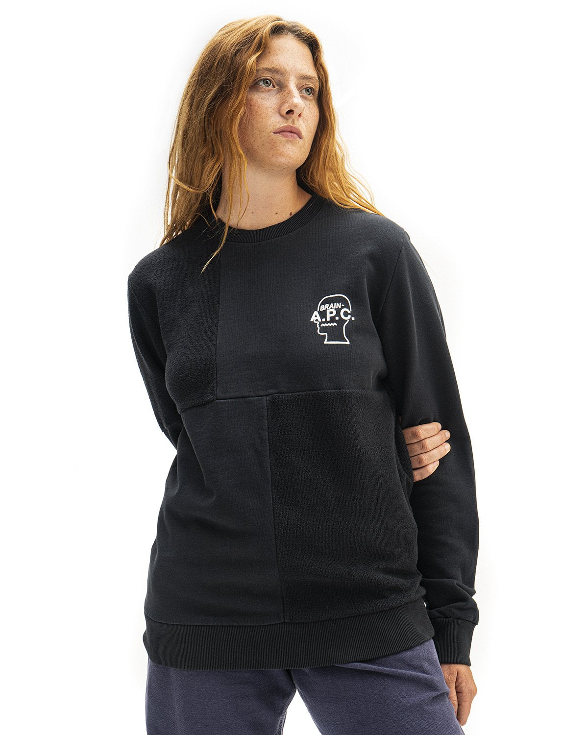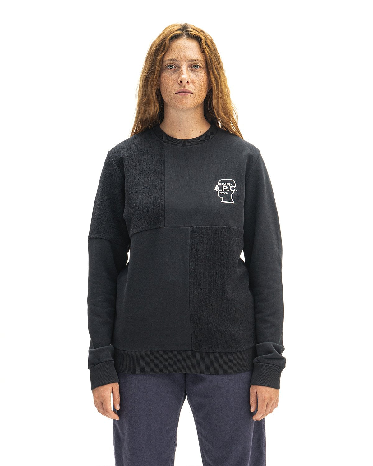 Brain Dead cotton fleece. Cotton fleece. Bouclé inside. Patchwork assembly using front and back of material. Brain Dead interaction: silkscreened logo on chest. Straight cut. Ribbed crew neckline. Long set-in sleeves. Ribbed cuffs. Straight hem. Wide ribbed bands at hem. The model is wearing a size M.