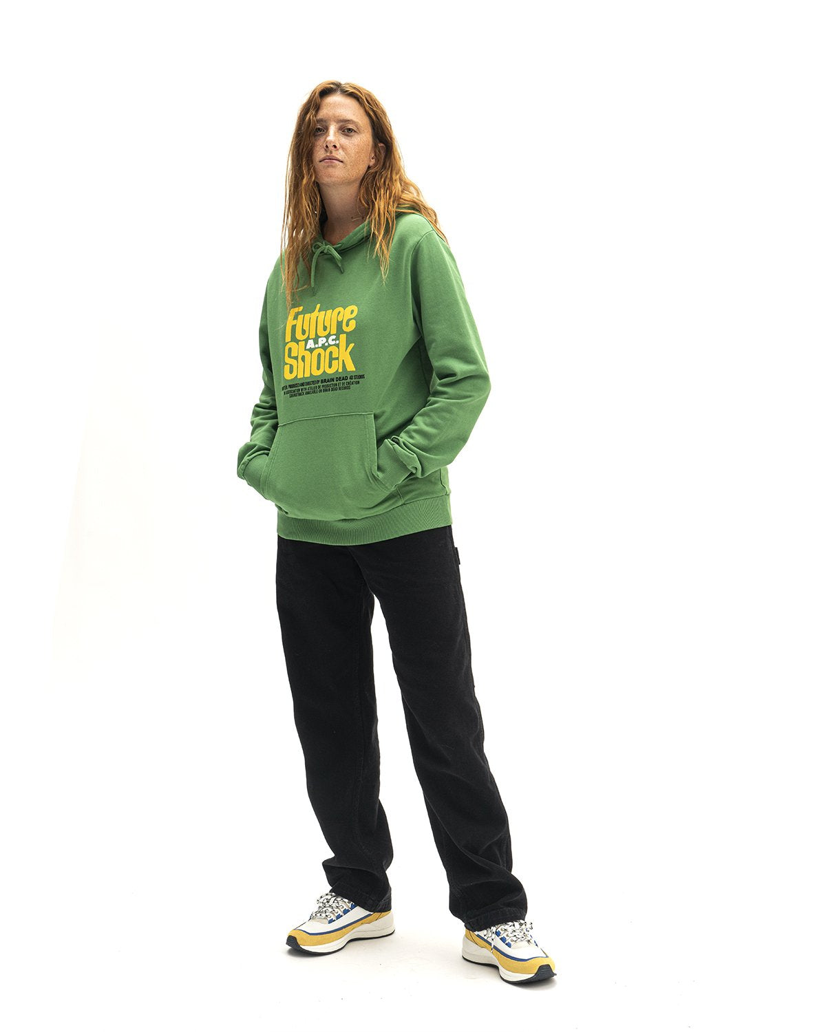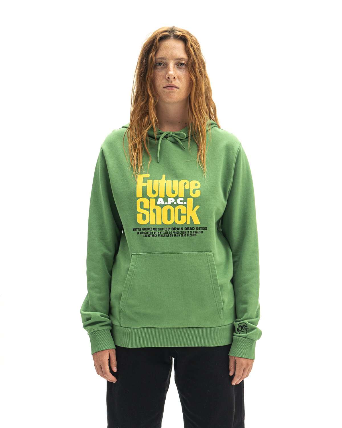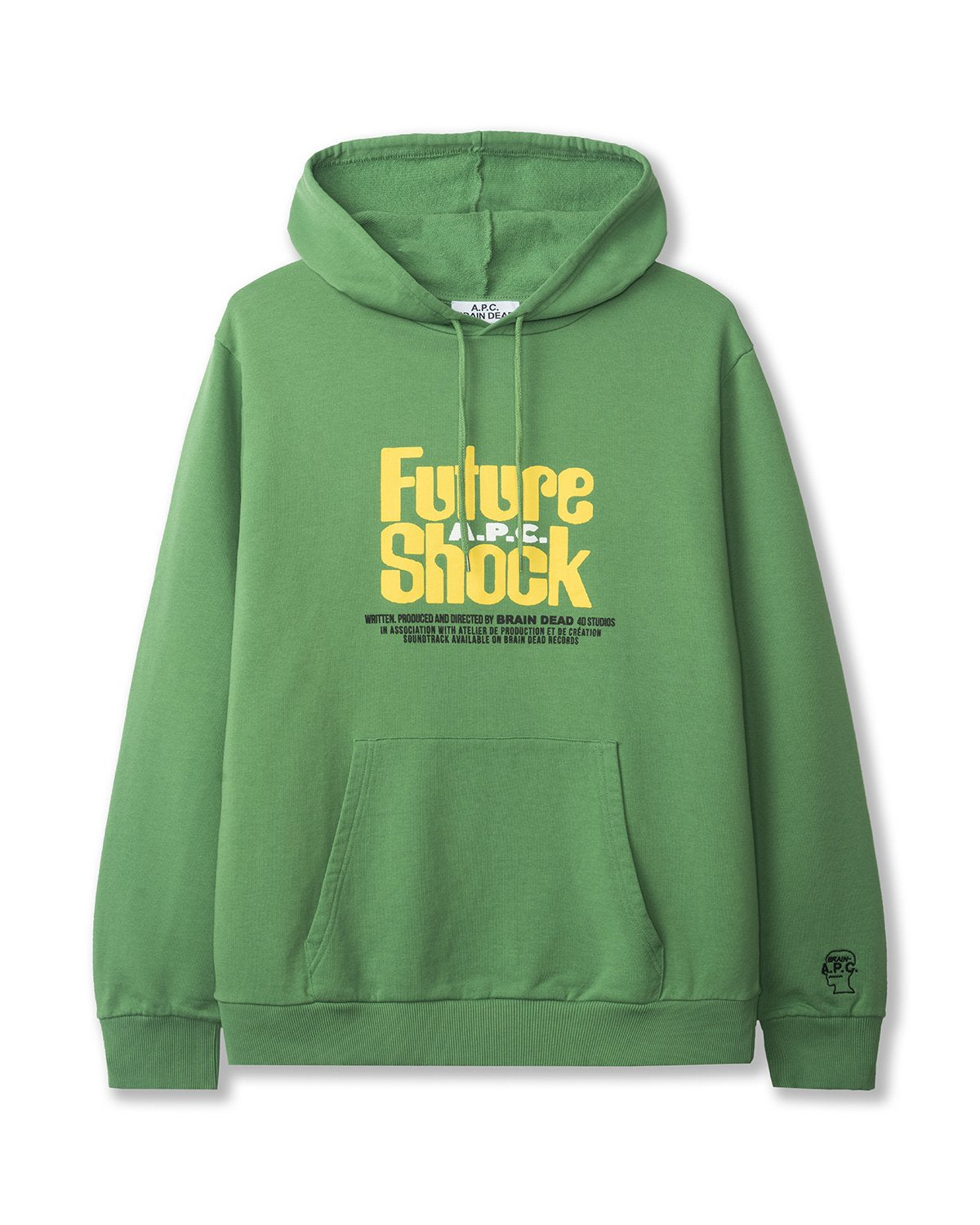 Brain Dead cotton fleece. Straight cut. Loose silhouette. Hood adjusts with round drawstring in knit cotton. Brain Dead interaction: silkscreened motif on chest. 'A.P.C. BRAIN DEAD' logo embroidered at wrist. Ribbed crew neckline. Long set-in sleeves. Ribbed cuffs. Straight hem. Wide ribbed bands at hem. The model is 187 cm tall and is wearing size M.