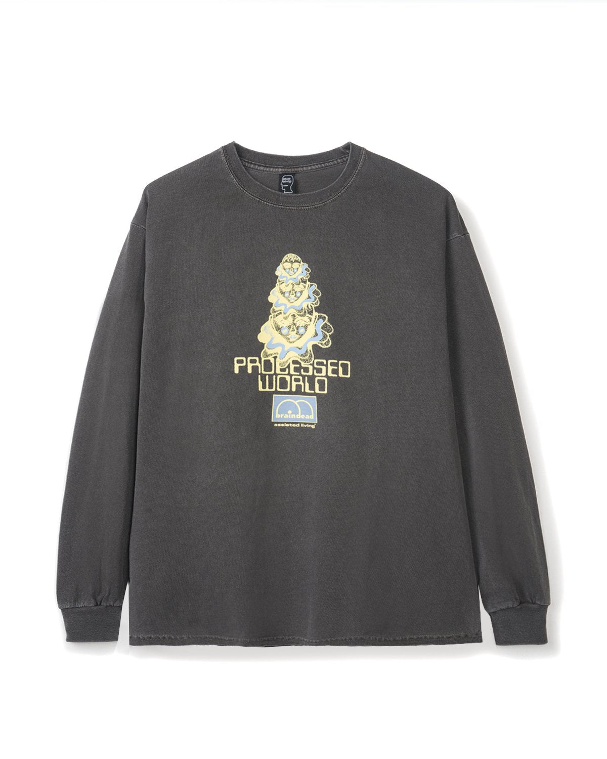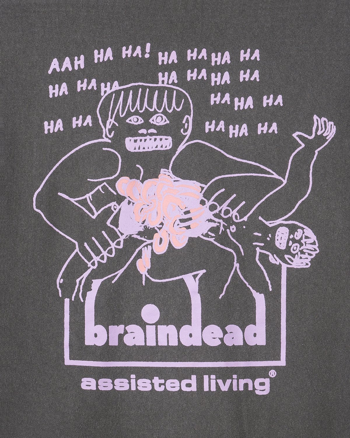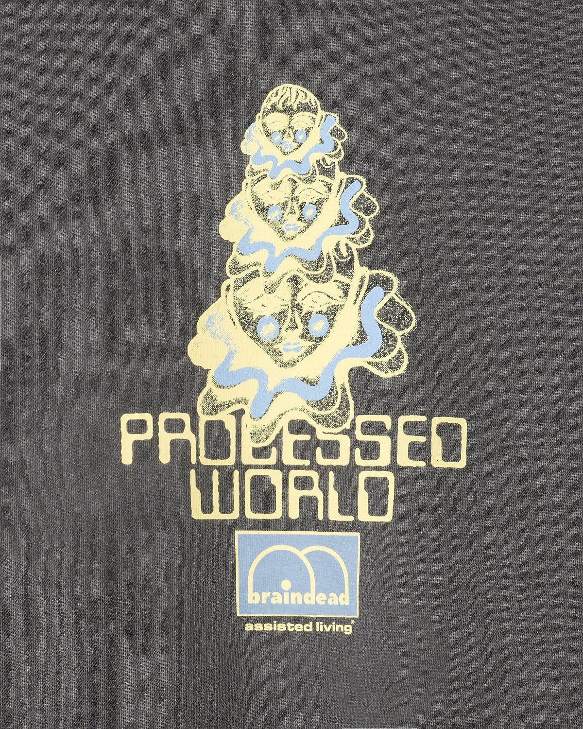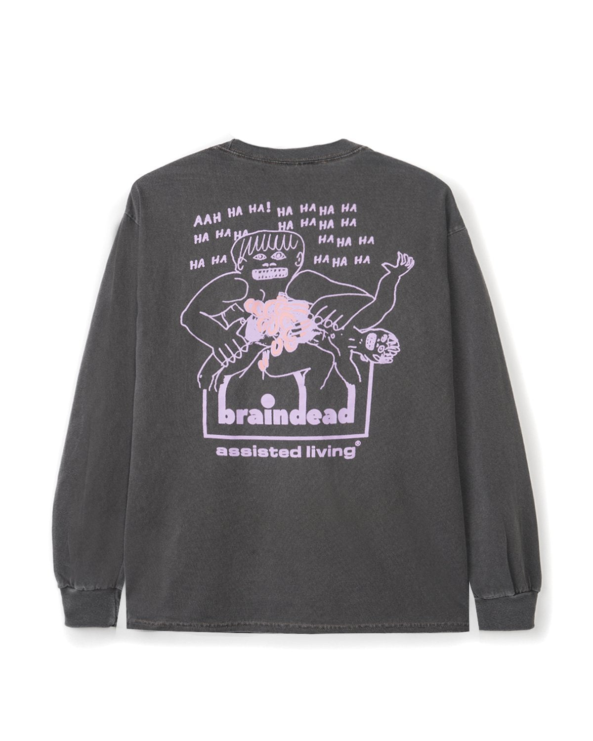 Graphic long sleeve tee. Front Yellow on blue processed world graphic supported by Brain Dead Assisted Living logo. Back features a violet graphic of a monster breaking a human. Brain Dead Assisted Living ™
