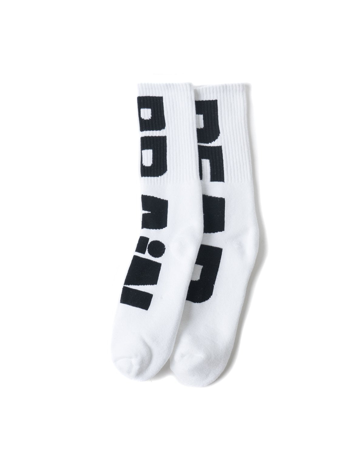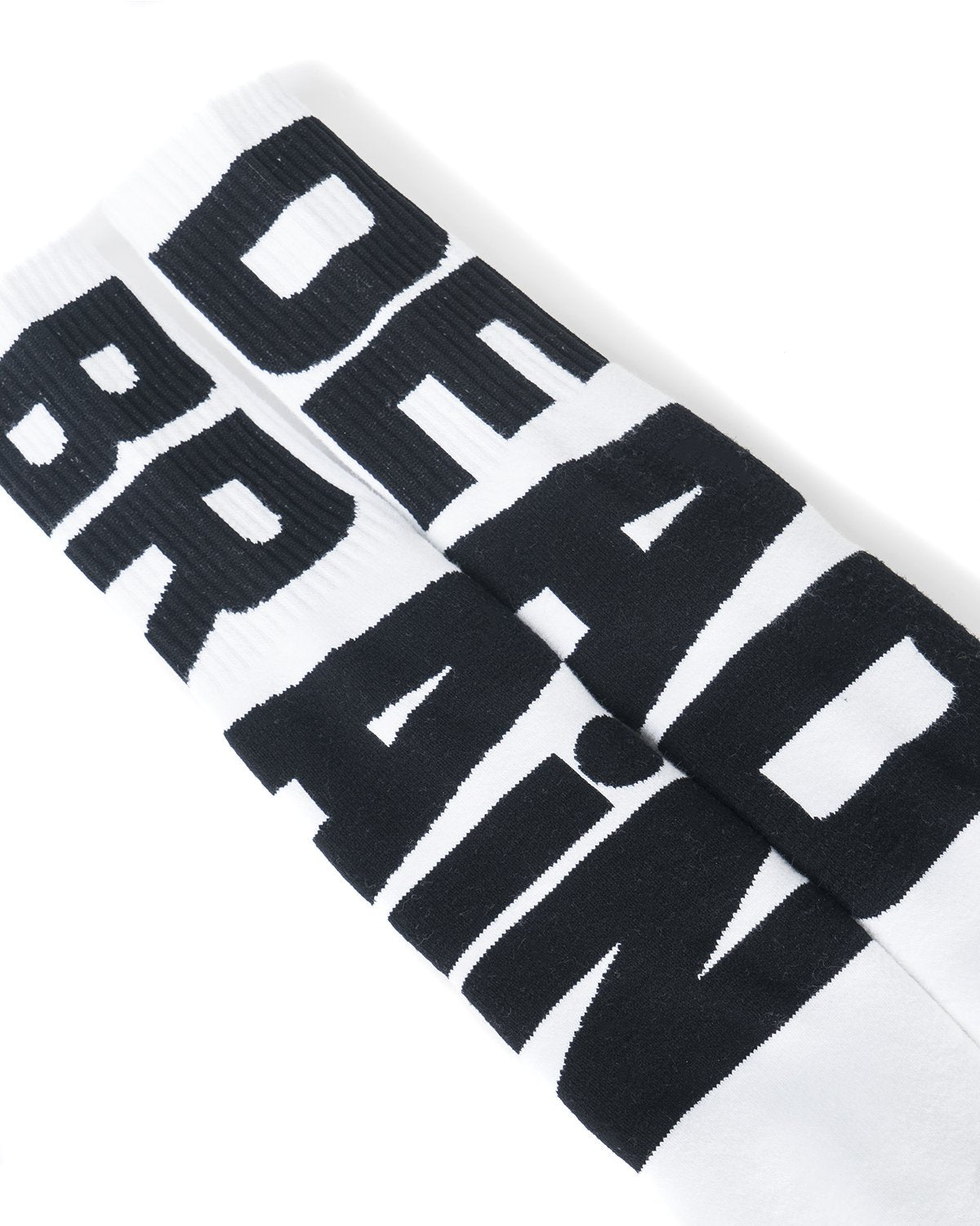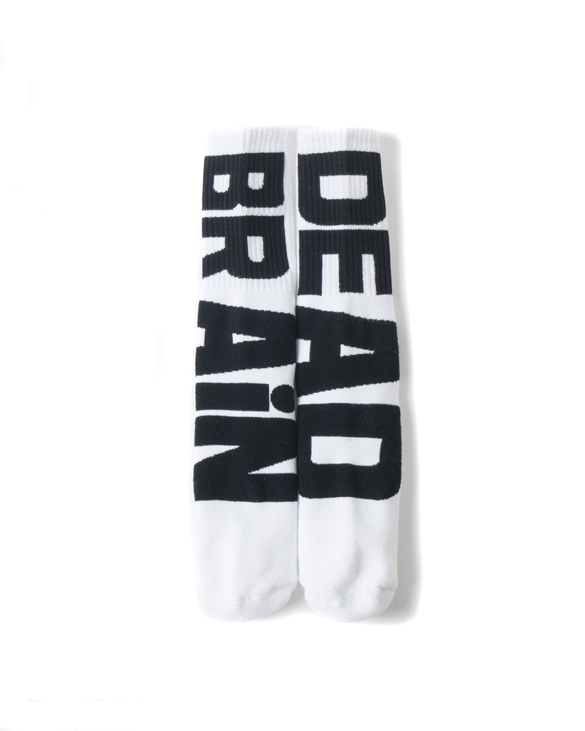 Thick, padded, comfy socks. Vertical logotype in black. Right reads brain left reads dead.