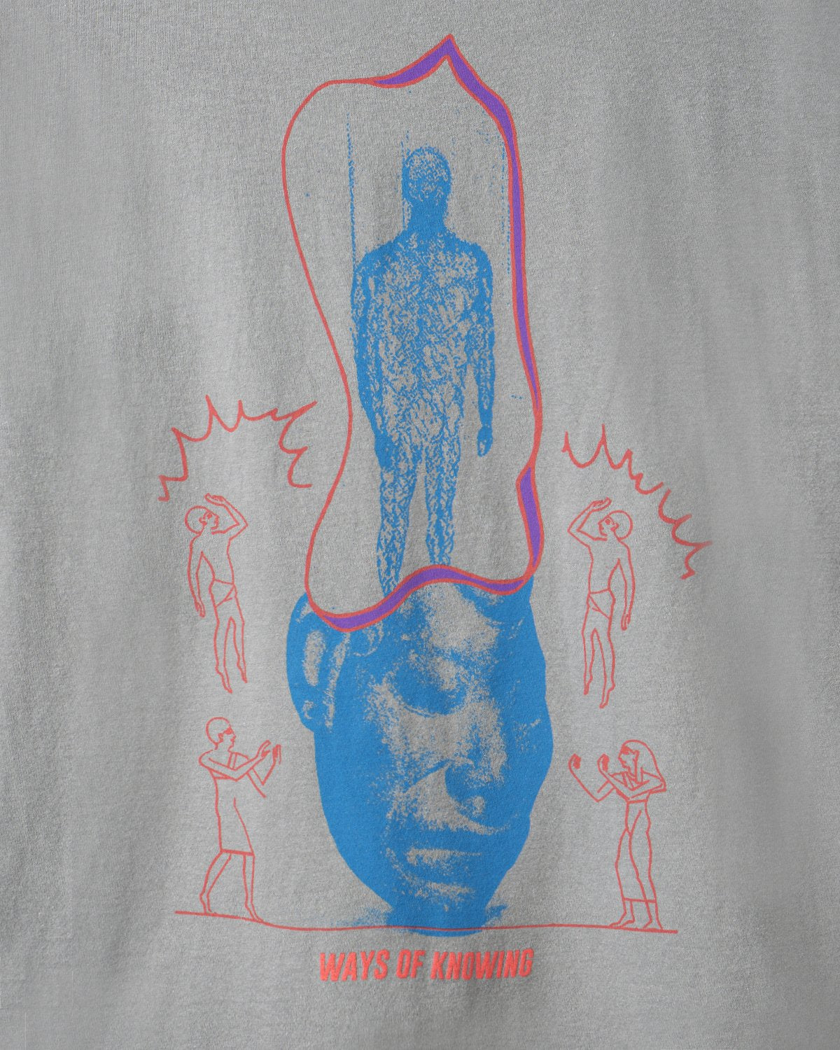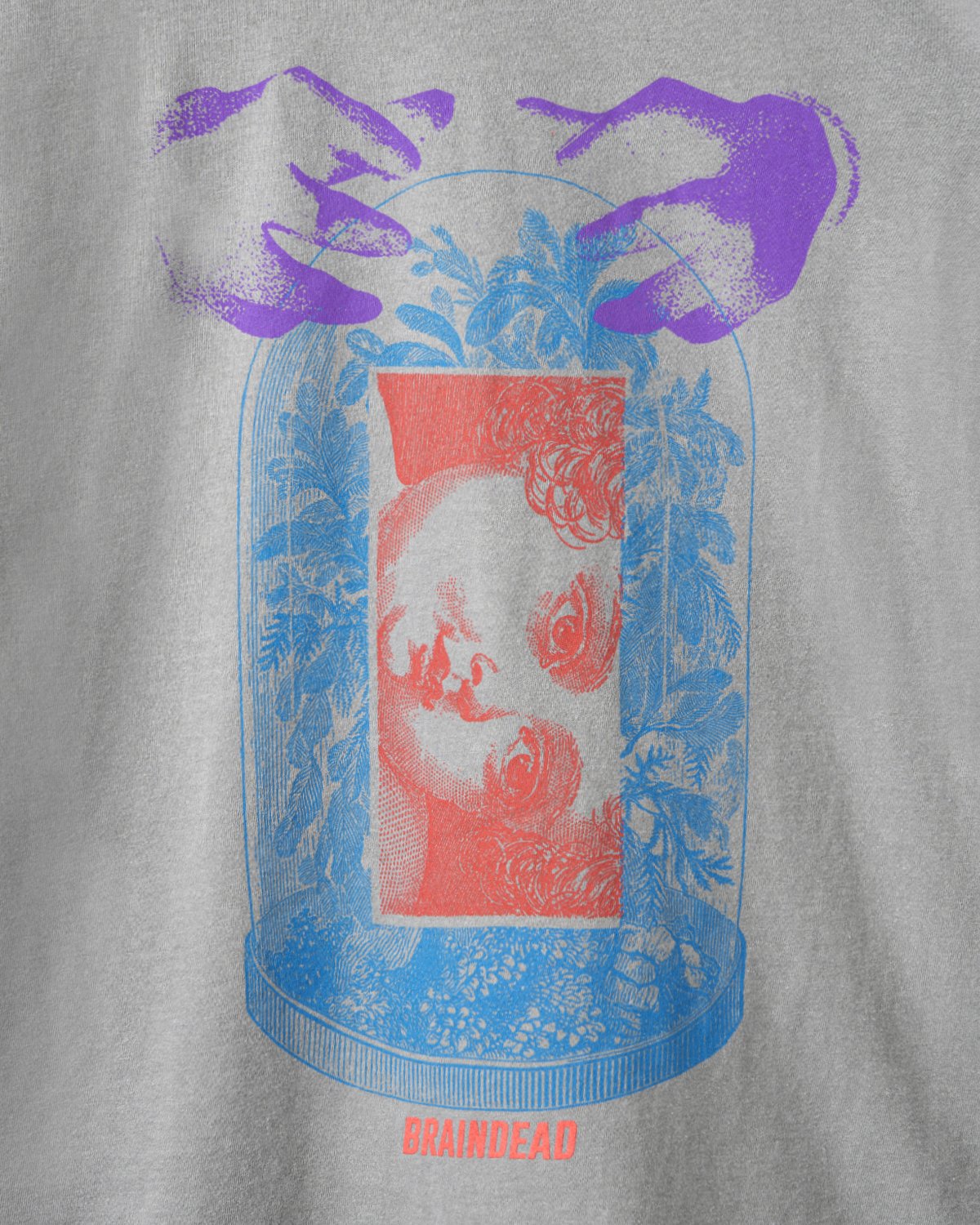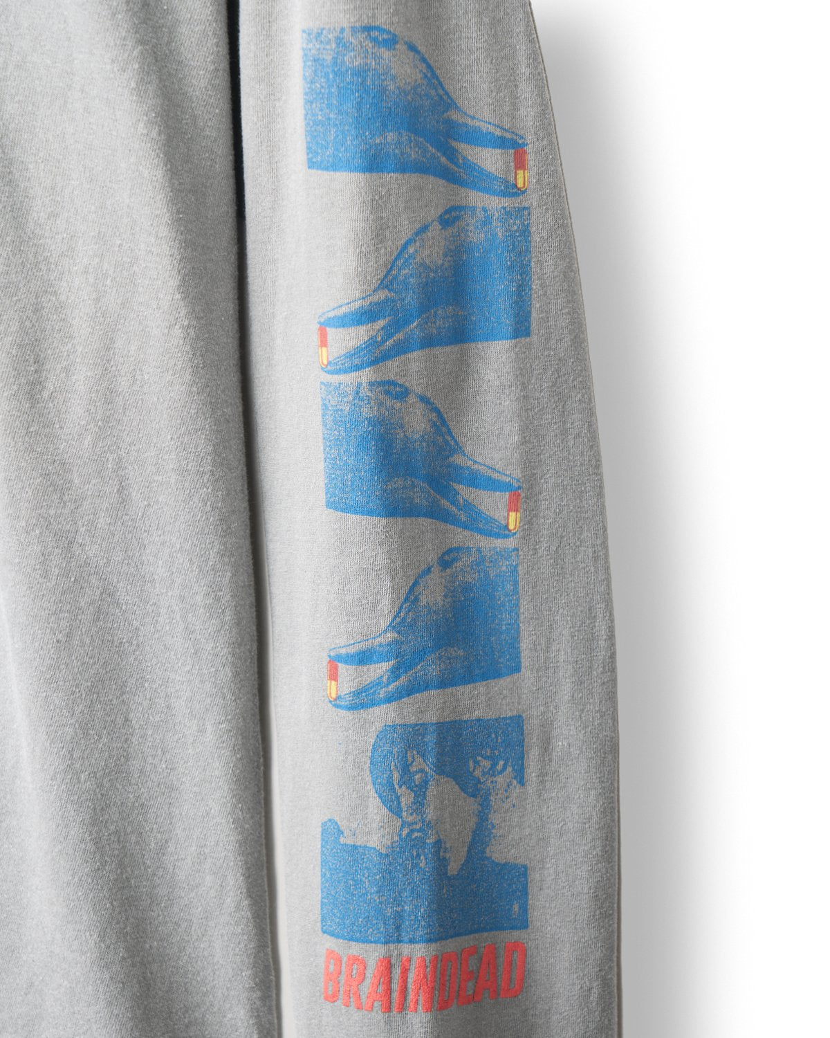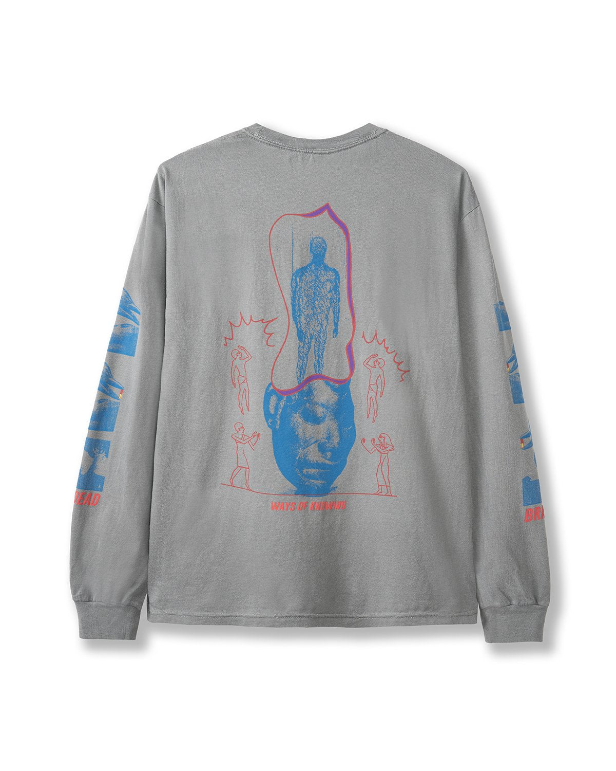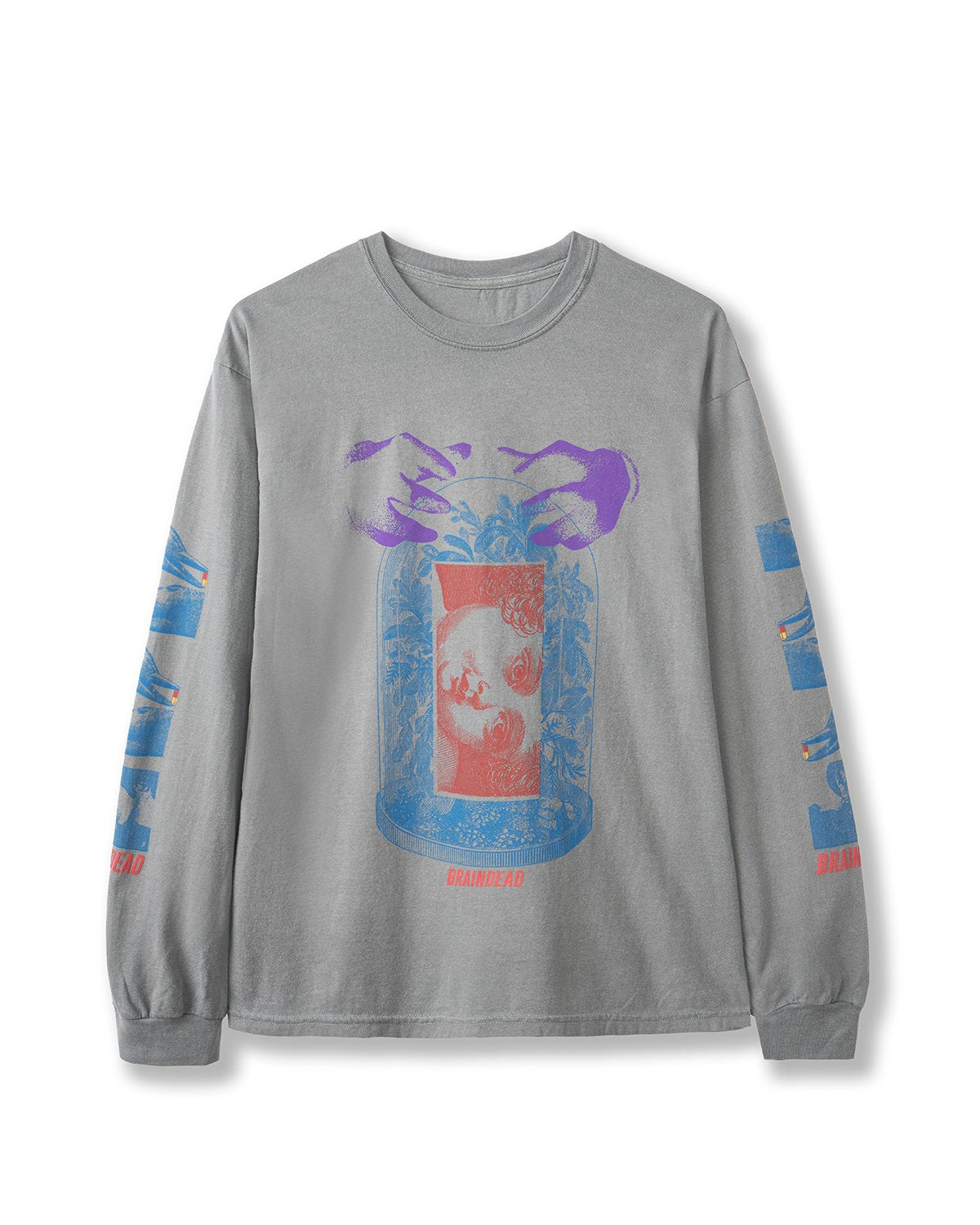 Our classic long sleeve tee can give you extra comfort for any day. Fits true to size. A classic painting in red is kept in a mystic shrine in blue. Two hands seem to start a mystic process. A Brain Dead italic logotype is featured in red below the figure. Its sleeves present blue dolphins holding a red and yellow pill on both sides. Again a Brain Dead logotype is featured on the sleeves. Back graphics explain the meaning of it all. A primitive head has a ghost-like figure in blue. Red humanoids are venerating the composition. Ways of knowing italic logotype sub-title this piece in red.